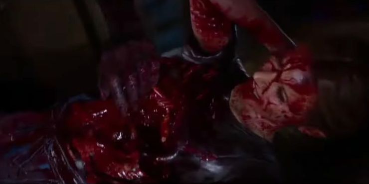Aparte de la carnicería abyecta y la violencia gráfica representada en la pantalla, es el orgulloso gruñido amenazador de Max después mientras se flexiona y se inclina sobre el cuerpo de Emma lo que realmente hace que la escena de la muerte sea tan inquietante. Peor aún, se muestra un primer plano extremo de la herida real, lo que la convierte en una de las muertes más sangrientas registradas.