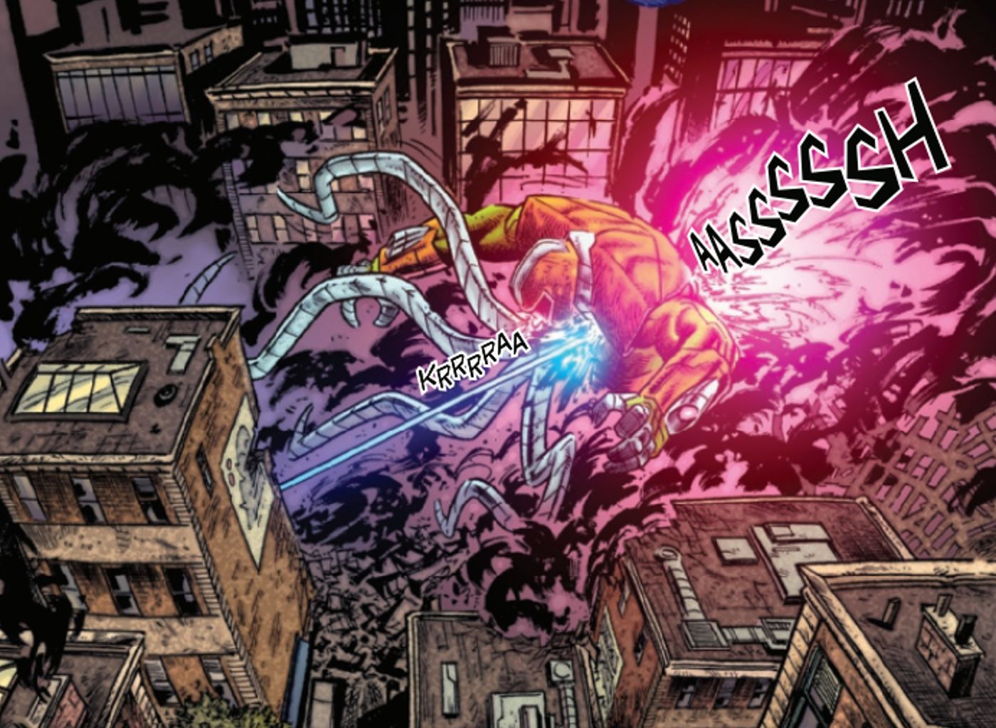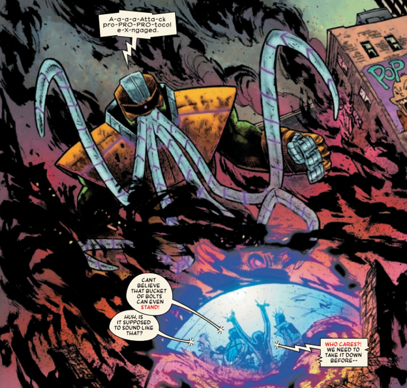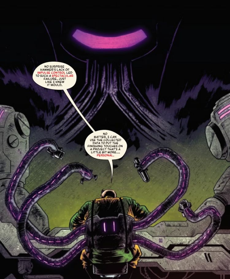 El diseño general del Sentinel-Slayer parece estar muy inspirado en Cthulhu de HP Lovecraft. La forma en que los tentáculos robóticos forman una especie de barba emite vibraciones lovecraftianas, y es una forma brillante de demostrar que esta máquina es inesperadamente difícil de entender cuando se trata de luchar contra ella.. Hay sorpresas reservadas para los héroes, ya que constantemente se enfrentan a varias tácticas de defensa, incluida una descarga eléctrica para aturdir a Mz. Marvel y un mecanismo de fuego ciego para librarse de Daredevil. Ahora, Doc Ock está usando “los datos recopilados para dar los toques finales a un proyecto que es un poco más…personal‘ con una figura siniestra acechando en las sombras sobre él. Esto insinúa que Sentinel-Slayer tiene mucho más reservado para Spider-Punk y la banda, y es algo que nunca verán venir.