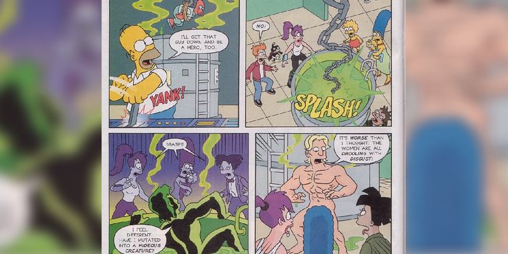 Jadeando ante la nueva apariencia humana de Zoidberg, Leela, Amy e incluso Marge Simpson se sorprenden por su metamorfosis, y Zoidberg se pregunta en voz alta si está “mutado en una criatura horrible” en función de sus reacciones inmediatas, e hilarantemente malinterpretadas. Dibujado en el siguiente panel en todo su esplendor vaporoso, desnudo, musculoso y rubio, Zoidberg confunde los ojos de Google y las bocas abiertas de las damas frente a él como una forma de repulsión, exclamando: “Es peor que Yo pensé. ¡Todas las mujeres están babeando de disgusto! incapaz de darse cuenta de que su cuerpo sexy en realidad los está excitando y molestando en lugar de enfermarlos del estómago.