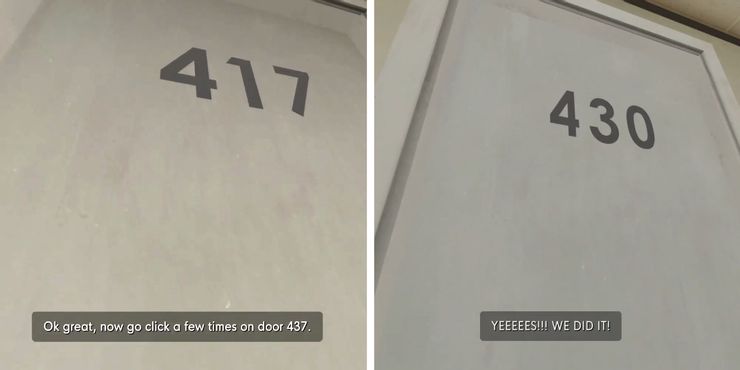 Luego, el Narrador le dirá a Stanley que ingrese veinte clics en la Puerta 417. Esta puerta se puede encontrar en el pasillo más allá de la segunda área de oficinas dentro de una pequeña habitación que se conecta a otro corredor en este vigilancia contra incendiossimulador de caminar de estilo. Luego, el jugador debe regresar a la Puerta 437, la puerta que se encuentra a la izquierda de la Puerta 430. Haga clic en la Puerta 437 tres veces para continuar.