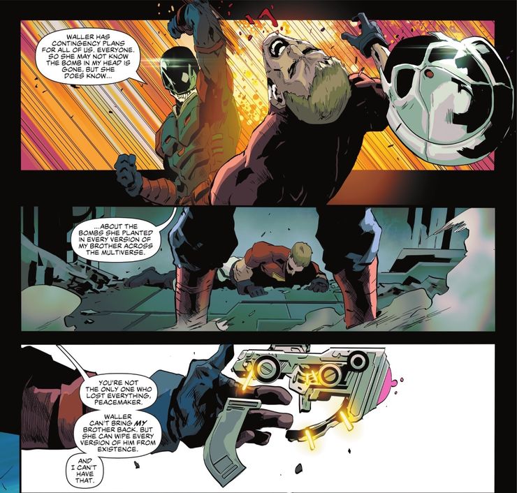 A pesar de perder su batalla con Bloodsport, lo que debería haber significado la ejecución de Peacemaker, DuBois le permitió decir una última cosa. Si bien el problema, de manera frustrante, no revela qué fue lo que dijo específicamente, aparentemente fue suficiente para convencer a Bloodsport de unirse al Escuadrón de Flag contra Waller, independientemente del riesgo que representaban todas las variantes de su difunto hermano. En cualquier caso, el hecho de que Waller inyectó todas estas variantes con bombas de cuello como medida de seguridad es extremadamente oscuro, y podría decirse que es una de las peores cosas que ha hecho el director de Task Force X.