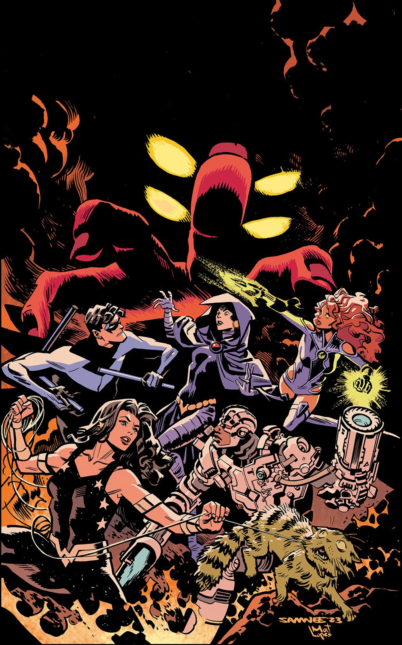 La portada de Chris Samnee para Titanes #10 muestra a los miembros de los Titanes juntos en medio de una batalla. Pero sobre el equipo se cierne sobre el enemigo de los Titanes y el padre de Raven, Trigon.quien extiende una mano hacia el equipo mientras intenta atraparlos.
