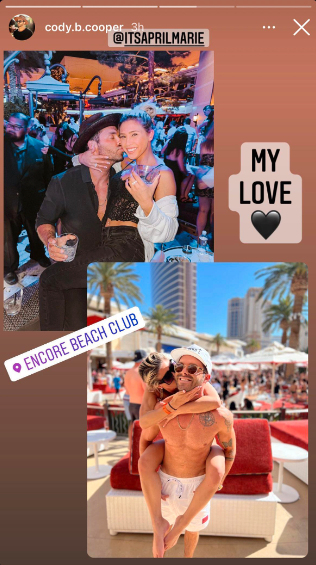 Según Instagram, es posible que April y Jake no estén haciendo que las cosas funcionen después de todo, ya que parece haber encontrado a alguien nuevo. Si bien se supone que las estrellas del programa no deben publicar nada en las redes sociales que pueda arruinar el programa para los fanáticos, el usuario de Instagram @cody.b.cooper rompió esa regla cuando compartió fotos de él y April en su historia. La publicación reveló dos imágenes de los dos, una en la que besa la mejilla de April y otra en la que la carga sobre su espalda. Subtituló la publicación “Mi amory etiquetó a la estrella, así como a Encore Beach Club en Las Vegas.