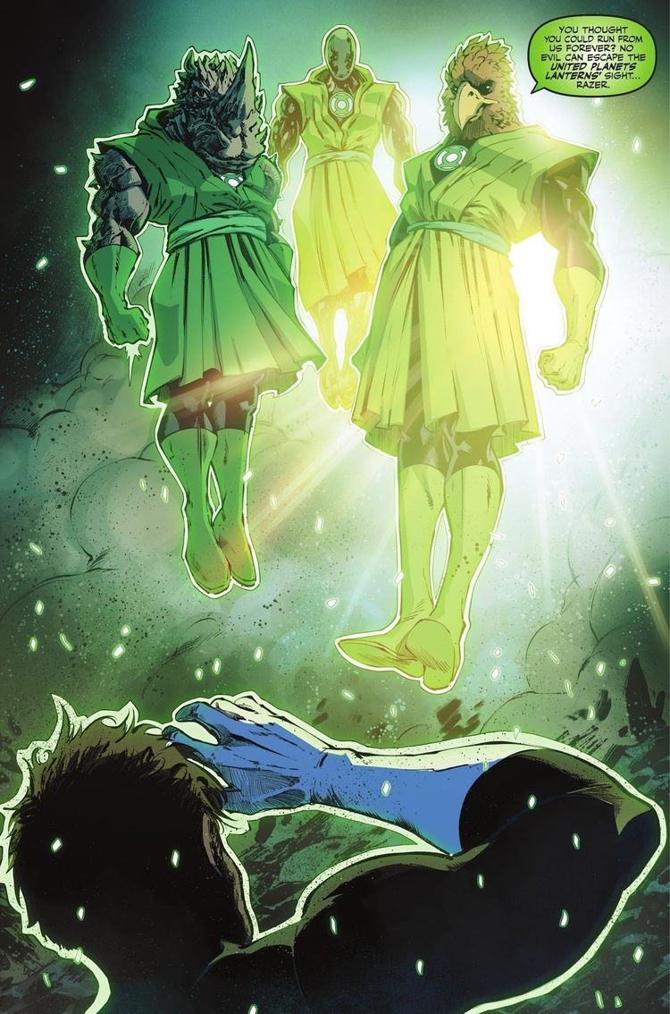 Sin embargo, United Planets ha creado algo innegablemente genial en su nuevo Lantern Corps, incluso si la intención puede ser siniestra. Los UP Lanterns aparentemente pueden utilizar la totalidad del espectro emocional. Sus túnicas cambian de color para reflejar esto, y en esta edición usan verde, azul y amarillo. De paso, Dos de estos tres colores han sufrido ataques en sus baterías de energía, lo que podría fortalecer la conexión potencial. entre los eventos. La nueva United Planets Lantern Corp puede ser una afrenta a la Linterna Verde Principios del cuerpo, pero sus nuevos poderes y uniformes son un espectáculo digno de contemplar.