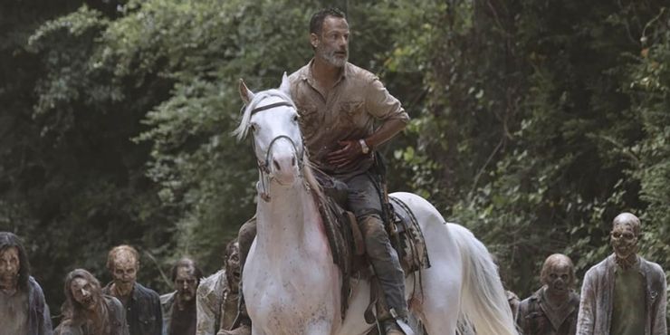 Rick escucha rápidamente su propio consejo, y en realidad se despierta de golpe, todavía empalado en una barra de refuerzo expuesta con una manada de caminantes masiva que se acerca a él. Y una vez más, para dar un giro completo a todo en una referencia al piloto, Rick se sube a un caballo y se aleja al galope.