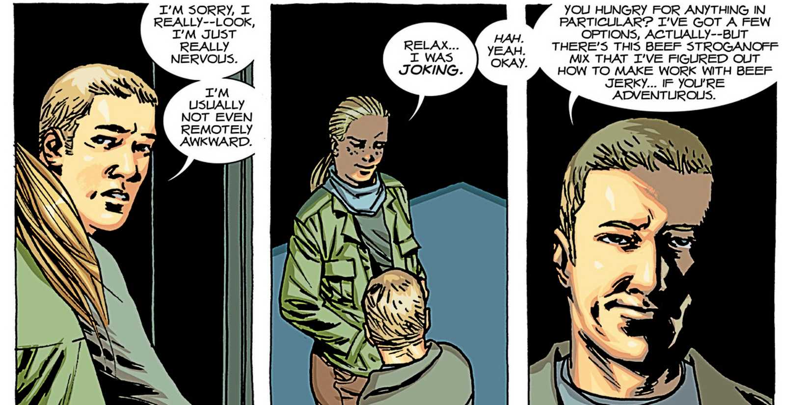 Kirkman admite que se le ocurrió la idea de Beef Jerky Stroganoff, que Consideró que era una elección adecuada para los sobrevivientes dado el duro entorno en el que vivían.. Él hace un punto válido. La vida en el apocalipsis zombie, tal como la describen Kirkman y Adlard, se parece mucho a vivir en una zona de guerra. Hay poca tierra accesible para cultivar cultivos frescos o criar ganado, un tiempo mínimo para dedicarlo a la agricultura o la cría de animales y casi ningún medio para proteger eficazmente a los trabajadores, los cultivos o los animales.