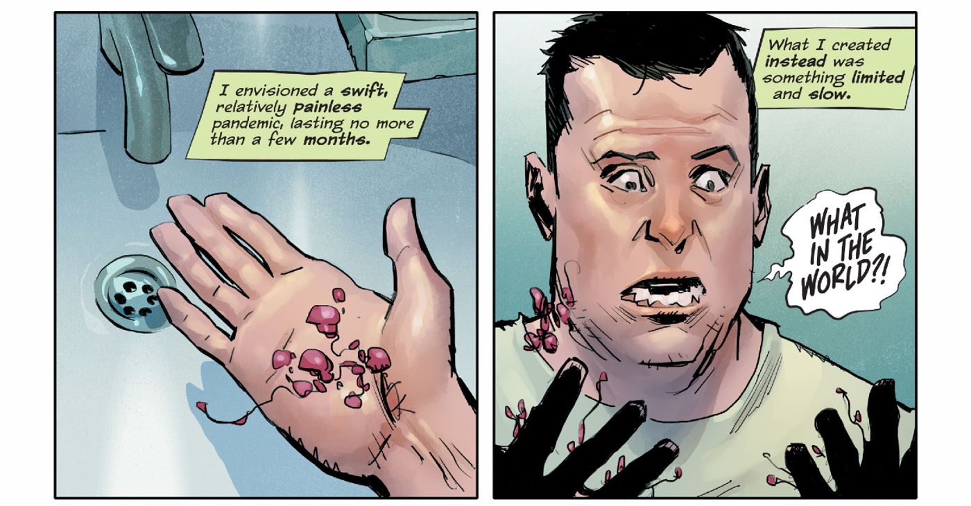 Una vista previa para Hiedra venenosa #16 de G. Willow Wilson y Marcio Takara continúa con Ivy pasando junto a un hombre al que infectó durante su plan para destruir la raza humana con un El ultimo de nosotros-Un hongo parecido al Ophiocordyceps Lamia. Terminó abandonando este plan una vez que se enfrentó al hombre que la creó, Jason Woodrue, y se dio cuenta de que no todos los humanos son tan malos como ella creía. Sin embargo, los restos del hongo que han estado latentes han comenzado a evolucionar y podrían convertirse en algo mucho peor de lo que jamás podría imaginar.