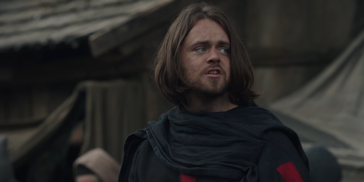 Joey Batey interpreta al cómico Jaskier en El Brujo, mientras que su papel en Caida de caballeros es mucho más serio. Su personaje, Pierre, es un espía que intenta descubrir más información sobre el Santo Grial.