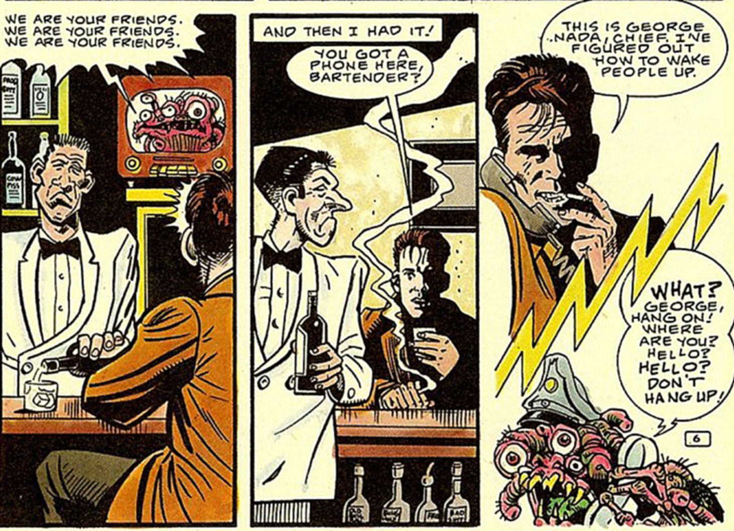 Los Fascinators de la adaptación del cómic “Nada” de “Eight O’Clock in the Morning” de Ray Nelson son inequívocamente extraterrestres. John Carpenter extrapoló perspicazmente un significado socioeconómico y político del trabajo de Nelson, y si bien esto ciertamente estaba latente en “Eight O’Clock”, la fuerza impulsora de la historia original de 1963 fue puro horror existencial. El protagonista se da cuenta de un orden superior de la realidad, un horror en sí mismo, y luego descubre que la verdad secreta del mundo es horrible y malévola. “Nada” profundiza esto con la interpretación artística de Bill Wray de los “Fascinators” como puros monstruos que alimentan pesadillas.