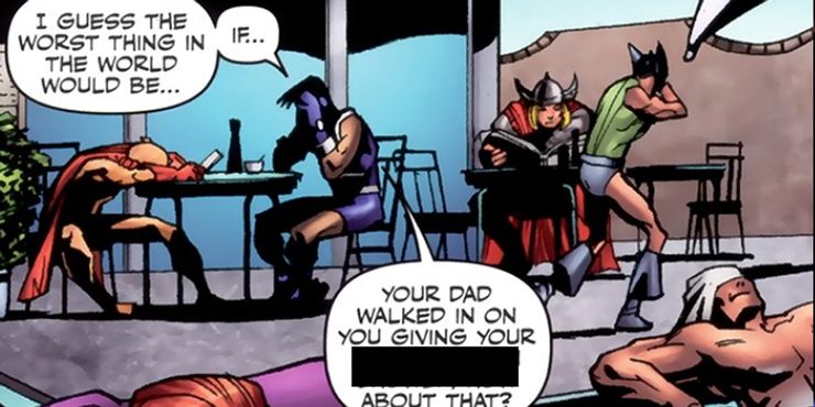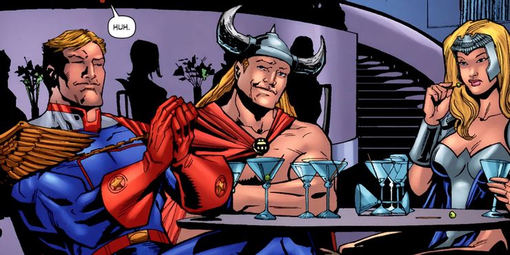 Obviamente, el Supe que se parece a Thor fue incluido en el cómic como un guiño divertido al héroe de Marvel. Este Supe nunca fue nombrado, no tenía líneas de diálogo y nunca interactuó con ninguno de los otros héroes en Herogasmo – ya sea en la batalla o en el dormitorio. Aún así, las apariciones secretas que hizo Thor fueron divertidísimas considerando el contexto del cómic. En Los chicos universo, Thor aparentemente fue a la fiesta de superhéroes más grande. Tómalo como quieras.