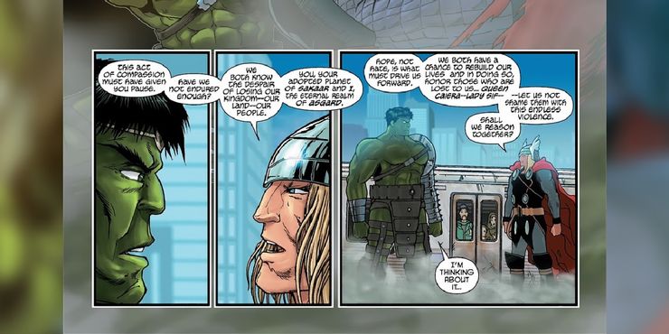 Golpeándose sin sentido, la pareja finalmente choca contra un sistema de metro donde un ciudadano de Nueva York angustiado les ruega ayuda. Pronto deteniendo su pelea, se muestra que Hulk y Thor están trabajando. juntos Para salvar a las personas atrapadas bajo tierra, Thor aprovecha esta oportunidad para relacionarse y hablar con compasión a Hulk a nivel personal (después de todo, ambos perdieron recientemente su hogar y su familia). Thor le dice a Hulk: “La esperanza, no el odio, es lo que debe impulsarnos hacia adelante”, afectando a Hulk hasta el punto de que accede a deponer las armas, lo que finalmente permite que todos los involucrados sobrevivan y dejen atrás esta situación en los mejores términos posibles.