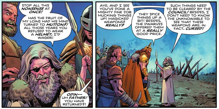 La versión de DC Comics de Thor puede disfrutar de las interminables batallas de Valhalla y el sabor del hidromiel después de cada victoria, pero su padre Odin no está impresionado con las acciones de su hijo o el hombre en el que se ha convertido. En Mujer Maravilla # 772, Thor logra la victoria en su última pelea, pero es interrumpido por un Odin que regresa, quien le dice a su hijo que ha estado haciendo todo mal.