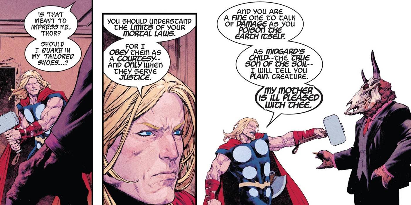 Thor inmortal El número 9 está escrito por Al Ewing y dibujado por Ibraim Roberson, y ve a Odinson enfrentarse tanto a Enchantress como al director ejecutivo de Roxxon, Dario Agger. Thor irrumpe en la oficina de Agger y destruye el escritorio del director ejecutivo en una impresionante demostración de poder. Agger no se inmuta. Thor amonesta a Agger, diciéndole que necesita comprender los límites de las “leyes mortales”.