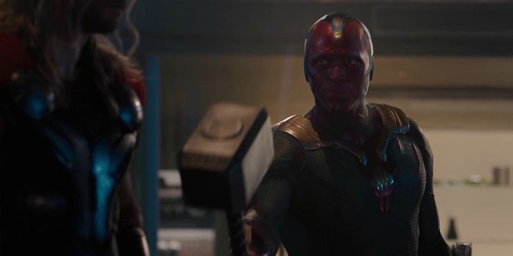 El superhéroe sintezoide Vision, interpretado en el MCU por Paul Bettany, es uno de los pocos Vengadores que ha demostrado ser digno de levantar a Mjolnir. Justo antes de la culminante batalla de Los Vengadores: La era de Ultronun recién nacido Vision levanta casualmente el martillo encantado, aparentemente sin darse cuenta del significado de su acción, antes de dárselo a Thor, completamente desconcertado.