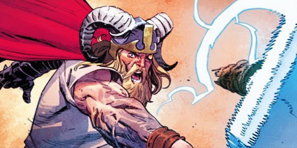 La vista previa muestra a Thor llegando para sentarse en su trono, en lo que parece ser una nueva ubicación, probablemente el corazón de su nuevo Asgard, anclado al recién nacido Árbol del Mundo, Yggdrasil. La falta de armadura de Thor es notable de inmediato, se parece más a un rey trabajador que a uno glorioso, incluso con los famosos cuervos de Odin que le cubren los hombros con su capa real. La runa para Thurisaz está tallado en el tronco del árbol sobre su trono (que representa la fuerza y el crecimiento a través de la lucha), lo que significa el amanecer de una nueva era, con Thor como Rey. Pero examinando cómo Thor deja caer su martillo al suelo con un audible golpear, antes de frotar la mano que lo sostenía … parecería que el hambriento Thor de ayer siente el peso del martillo y la corona.
