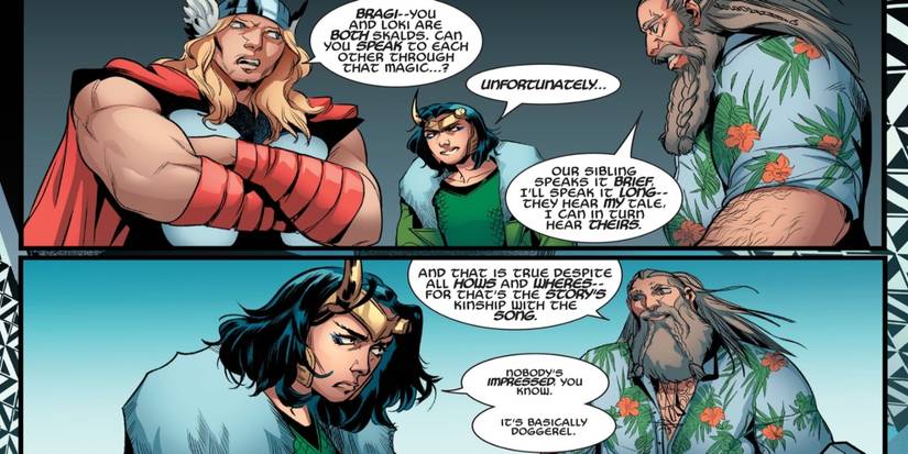 - El regreso de Bragi molesta a Loki, ya que Loki es el Dios de las Historias mientras que Bragi es el Dios de los Poemas; ambos son narradores de maneras opuestas.