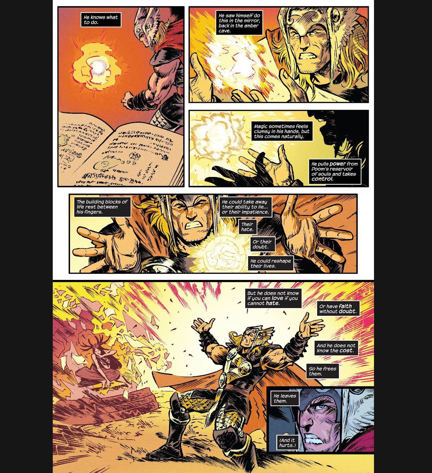 Todo esto es para decir que si bien la magia de Thor puede ser torpe, él tiene la fuerza bruta para lograr por la fuerza lo que no puede hacer con la habilidad. Caso en cuestión: los hechizos del Doctor Doom son lo suficientemente fuertes como para enredar a Hela, ella misma una de las asgardianas más fuertes, mientras que el propio Doom ha dominado las artes místicas hasta un grado que le permite competir (aunque sin éxito) por el título de Hechicero Supremo. A pesar de todo esto, Thor puede usar su poder para deshacer la magia de Doom solo con fuerza bruta.