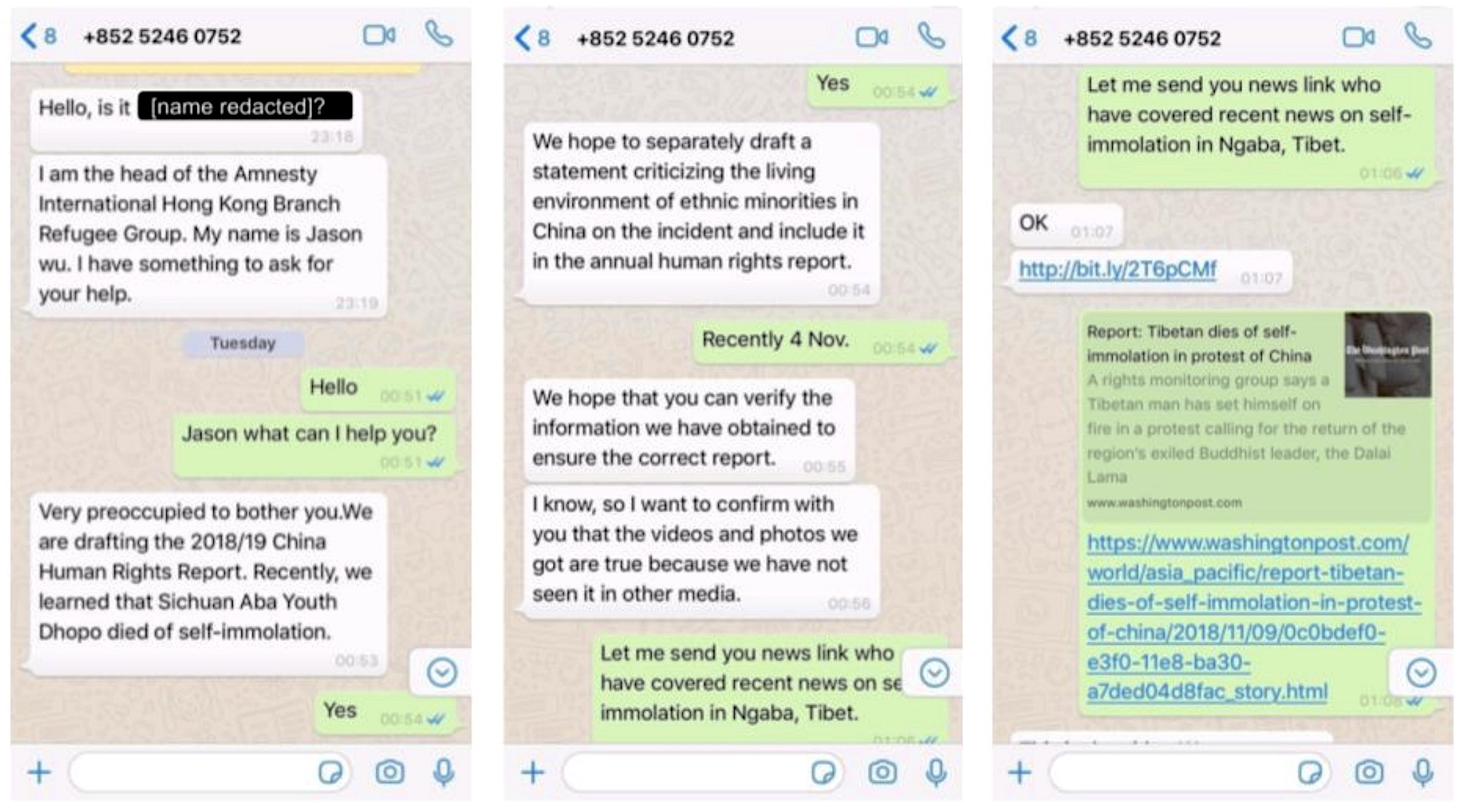 En su nueva investigación publicada el martes y compartida con TechCrunch, Citizen Lab dijo que varias víctimas tibetanas fueron atacadas con enlaces maliciosos enviados en mensajes de WhatsApp por personas que pretendían trabajar para Amnistía Internacional y The New York Times. Los investigadores obtuvieron algunos de esos mensajes de WhatsApp de TibCERT, una coalición tibetana para compartir inteligencia sobre amenazas, y descubrieron que cada mensaje fue diseñado para engañar a cada objetivo para que haga clic en el enlace que contiene el exploit. Los enlaces se disfrazaron mediante un servicio de acortamiento de enlaces, lo que permitió a los atacantes enmascarar la dirección web completa, pero también obtener información sobre cuántas personas hicieron clic en un enlace y cuándo.