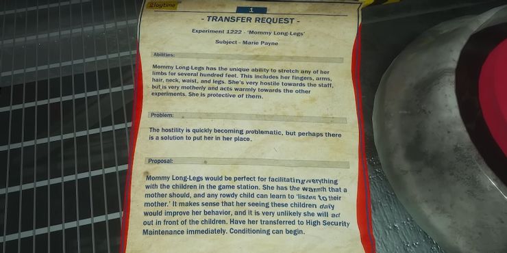 Los humanos que se convirtieron en juguetes en tiempo de juego de amapola no fueron elegidos al azar. Las letras y las cintas VHS son los primeros indicadores de los rasgos que los investigadores buscaban en sus sujetos. Se menciona que Huggy Wuggy es un éxito porque tiene un alto nivel de inteligencia combinado con un alto nivel de obediencia. La inteligencia es importante para los investigadores, ya que también se menciona en un experimento anterior: el Prototipo. Los jugadores pueden encontrar una nota en Tiempo de juego de amapola cap. 2 sobre Marie Payne, quien se convirtió en Mami Piernas Largas. La nota habla de que sus cualidades cariñosas se transfirieron a Mommy Long Legs con ella, y que ama a los niños, pero los investigadores notaron que su agresión cuando los niños no estaban cerca era un problema inesperado que debía abordarse.