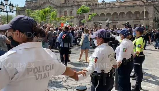 En la Plaza de Armas, frente a Palacio de Gobierno, los manifestantes se encontraron con un cinturón de seguridad integrado por mujeres policías municipales de Guadalajara, Protección Civil y policía vial, desarmadas, sin cascos ni escudos.