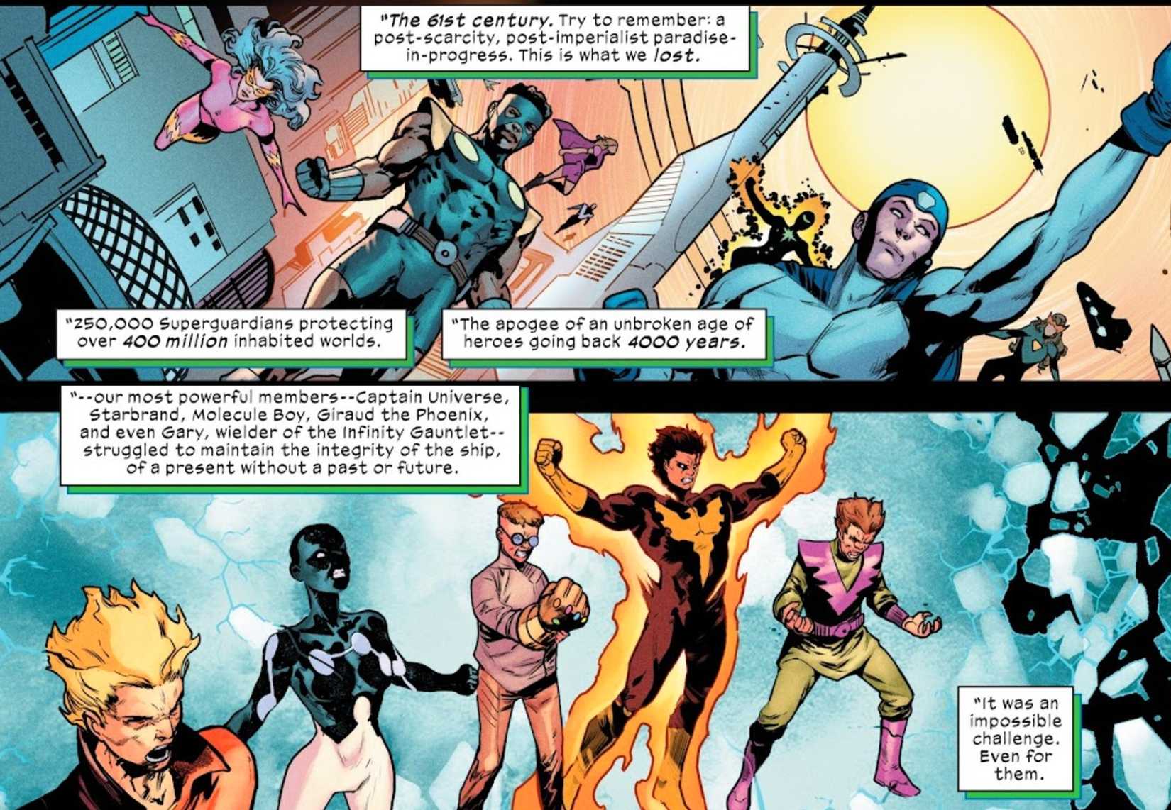 Sin embargo, los fanáticos pueden ver a los Guardianes en el apogeo de su poder, y la verdadera forma del equipo es asombrosa. Los Guardianes no solo son parte de un grupo que protege 400 millones de mundos, sino que sus pesos pesados ​​incluyen Starbrand, Captain Universe, una versión más joven de Molecule Man, un Giraud potenciado por Phoenix-Force y un nuevo portador del Infinity Gauntlet llamado Gary. Para poner esos nombres en contexto, Molecule Man es tan poderoso que podría destruir a Galactus con un solo pensamiento.