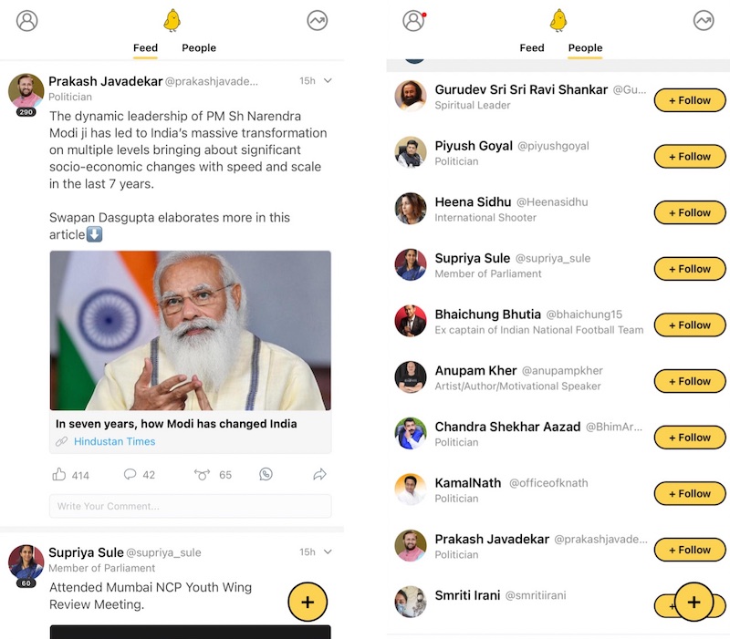 Al igual que Twitter, la aplicación Koo permite a los usuarios publicar publicaciones en inglés y en media docena de idiomas indios. Su interfaz, logotipo y mecanismo de intercambio social son sorprendentemente similares a los de Twitter.