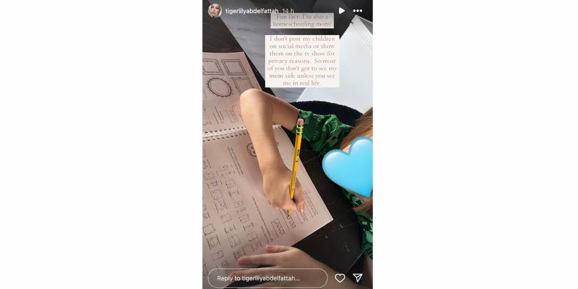 Lirio de tigre es una influencer de las redes sociales con más de 700.000 seguidores, incluso antes de convertirse en una estrella de telerrealidad. Si bien no tiene mucho contenido en su página, ha estado usando Instagram Stories para interactuar con sus seguidores y compartir información sobre su vida detrás de escena con aquellos interesados. Tigerlily compartió recientemente una foto de uno de sus hijos haciendo la tarea y reveló una “Dato curioso” sobre ella misma. Ella reveló que Ella también es una “¡Mamá que educa en casa!“ El hijo de Tigerlily parecía estar trabajando en sus letras en inglés y ella cubrió su rostro con un emoji de corazón azul.