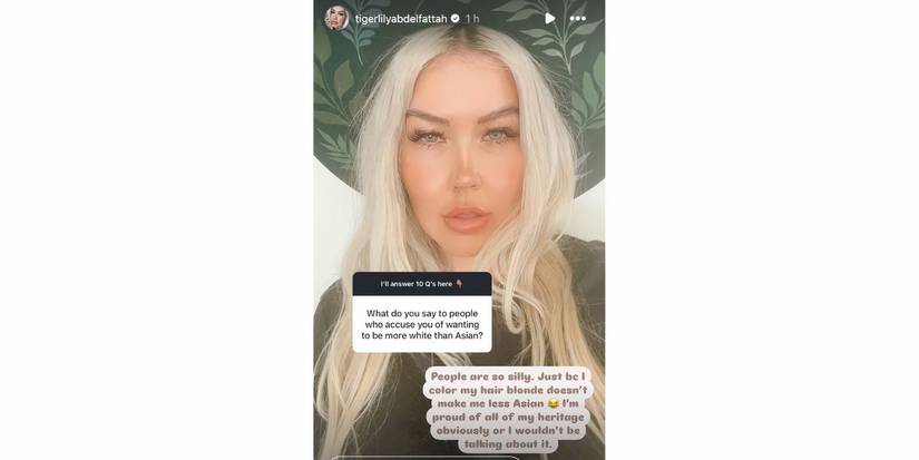 lirio de tigre ha tenido cabello rubio platino durante los últimos años, lo que confunde a los espectadores sobre su origen étnico. Parece que algunas de estas personas también la acusan de querer ser “más blanco que asiático.” Tigerlily compartió una foto de ella haciendo pucheros mientras usaba un sombrero de ala ancha y escribió: “La gente es tan tonta.“Tigerlily añadió que El hecho de que se tiña el pelo de rubio no la hace menos asiática.. Ella escribió que estaba orgullosa de “todo” de su herencia y dijo que era obvio porque, de lo contrario, no estaría hablando de ello.