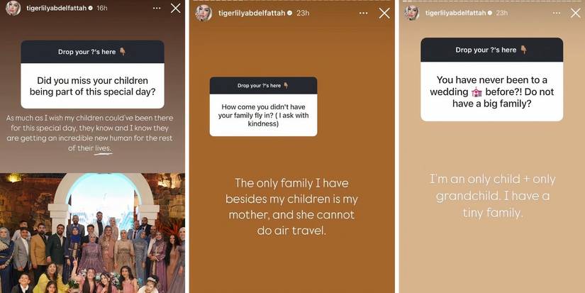 lirio de tigreEl estilista Cruz y el esteticista Shay fueron las únicas personas que acompañaron a Tigerlily a Ammán. Eran parte de su equipo glamoroso y no realmente su familia, lo que dejó a los fanáticos preguntándose dónde estaba la verdadera familia de Tigerlily. Algunos fanáticos se acercaron a ella en Instagram para preguntarle detalles sobre su vida personal. Ella reveló que es hija única y única nieta. Tiene una familia pequeña. La única familia que tiene además de sus hijos es su mamá. Según Tigerlily, su madre no puede viajar en avión. Admitió que extrañaba tener a sus hijos allí en su día especial.