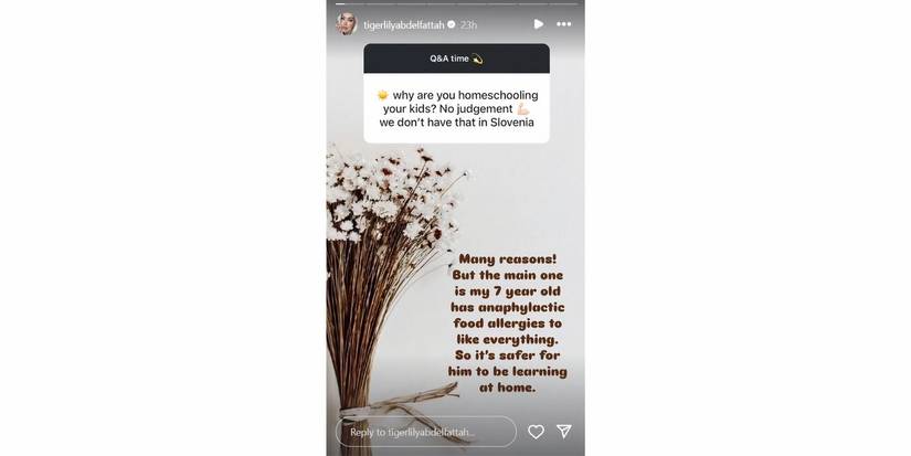 Tigerlily ha decidido no mostrar a sus hijos en Prometido de 90 días, lo que llevó a los fanáticos a tener varias preguntas sobre ellos. Tigerlily compartió recientemente que ella es una “mamá educando en el hogar”pero ha compartido más detalles sobre por qué eligió educar a sus hijos en casa. Tigerlily le dijo a un fan que tenía “muchas razones“Por ello, pero el principal fue que su hijo de siete años hijo tiene “alergias alimentarias anafilácticas para que te guste todo.” Explicó que es más seguro para su hijo aprender en casa que ir a la escuela. El hijo de Tigerlily tampoco asistió a su boda porque no podía volar comercialmente.