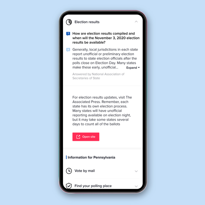 TikTok ha estado acumulando sus recursos relacionados con las elecciones durante meses. Este verano, anunció asociaciones ampliadas con PolitiFact y Lead Stories para verificar la información errónea relacionada con las elecciones estadounidenses de 2020 en su aplicación, además de su trabajo para ayudar con la información errónea relacionada con COVID-19, el cambio climático y otros temas.