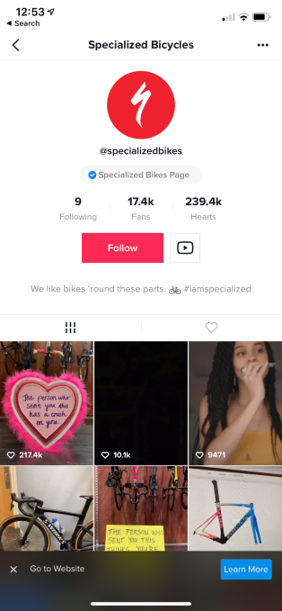 Es de suponer que este botón podría personalizarse para enviar a los usuarios al sitio web del anunciante o a cualquier otra dirección web, pero por el momento solo abrió la página de perfil de bicicletas especializadas (@specializedbikes) dentro de la aplicación TikTok.