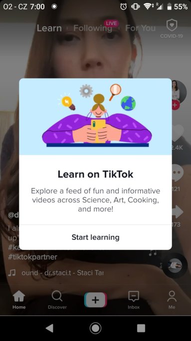 Destacado de forma destacada junto a “Para ti” y “Siguiente” en la parte superior de la pantalla de inicio, TikTok describe Learn como un lugar para descubrir videos instructivos e informativos publicados por los usuarios que llevan a los espectadores a través de la elaboración de alimentos, la producción de arte, cómo funcionan los procesos científicos y más.