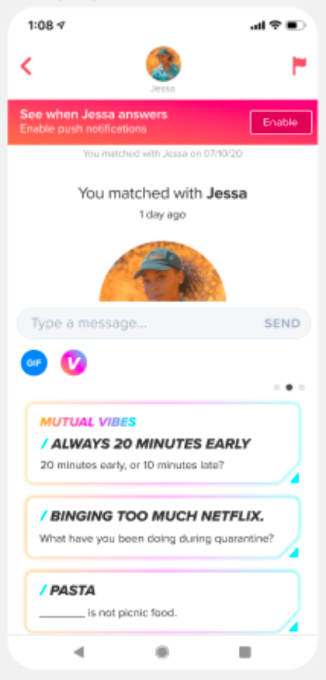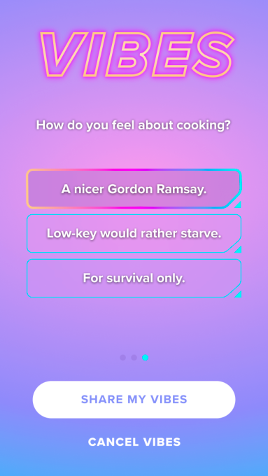 Sin embargo, la experiencia de Vibes en sí no es una serie de videos producidos. En cambio, Vibes presenta a los usuarios una serie de preguntas que van desde los rasgos de personalidad hasta la cultura pop. Una vez más, como Swipe Night, sus respuestas se mostrarán en su perfil, en este caso, durante 72 horas. Y cuando los partidos que participaron en Vibes comiencen a chatear, podrán ver las respuestas de los demás directamente dentro de la ventana de chat, dice Tinder.