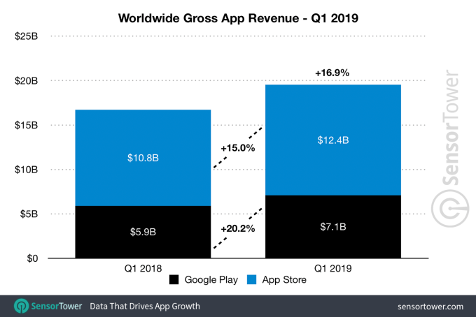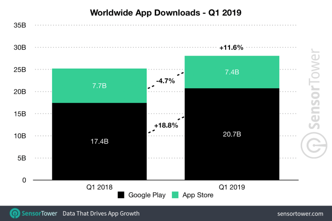 En general, la tienda de aplicaciones de Apple representó el 64 por ciento de los ingresos en el primer trimestre, y el gasto de los consumidores alcanzó los $ 12,4 mil millones en comparación con los $ 7,1 mil millones de Google Play. Las descargas de nuevas aplicaciones disminuyeron en iOS en el primer trimestre, disminuyendo un 4.7 por ciento año tras año, a 7.4 mil millones, mientras que las descargas de Google Play crecieron un 18.8 por ciento a 20.7 mil millones.