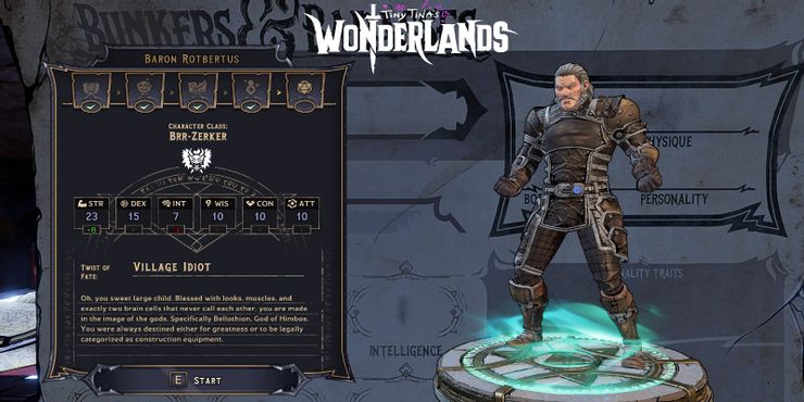 Después de que los jugadores elijan su clase inicial en El país de las maravillas de Tiny Tina, se les pedirá que elijan un Fondo de personaje para su Fatemaker. A diferencia de otros aspectos del sistema Hero Stats, esta es una elección permanente que hacen los jugadores y que tendrá un gran impacto en su personaje. Cada fondo aumentará y disminuirá el valor inicial de varias estadísticas de héroe asociadas con ese fondo. Esto también ajusta el valor máximo de esa estadística. Esto significa que Village Idiot no solo aumenta la Fuerza inicial del personaje a 18, sino que también aumenta la Fuerza máxima a un gigantesco 38. A continuación, se muestra una lista de los cinco Trasfondos de personajes y los ajustes de estadísticas asociados con ellos: