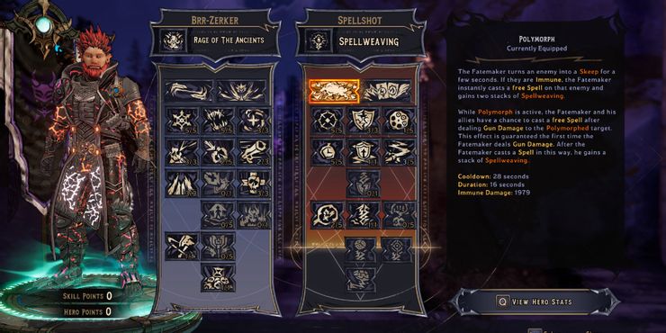 Spellweaving es la dote de clase de Spellshot, que aumenta el daño de hechizo cada vez que se lanza un hechizo o se recarga un arma. Cuando se combina con la dote de clase Brr-Zerker en El país de las maravillas de Tiny Tina, llamado Rage of the Ancients, los jugadores tienen la oportunidad de acumular rápidamente su arma, hechizo y daño de Escarcha al mismo tiempo. Rage of the Ancients hace que los Fatemakers se enfurecen cada vez que la Habilidad de Acción, agrega Daño de Escarcha o Daño de Escarcha adicional a los ataques de cualquier fuente. La duración de Rage of the Ancients no se agotará mientras una habilidad de acción esté activa, lo que demuestra ser particularmente lucrativo si la habilidad de acción es Polimorfia.