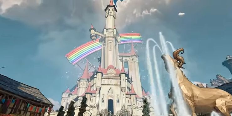 Castle Sparklewithers es el hogar de Queen Butt Stallion, el binicorn de diamante (unicornio con dos cuernos) que gobierna todas las Maravillas y está listo para trabajar con los jugadores para derrotar al Señor del Dragón, quien resulta ser su archienemigo. El castillo de la Reina se encuentra dentro de la ciudad portuaria de Brighthoof, y se describe como “Más brillante que las estrellas más brillantes, más mágico que los magos más majestuosos. “Castle Sparklewithers se parece mucho al icónico castillo de Disney en términos de diseño, excepto que la parte superior está un poco torcida y hay un arco iris protésico adherido a la parte posterior. Las características del castillo “Paredes brillantes ultra-super-geniales y deslumbramientos de arcoíris deslumbran a las torres”, y la casa de la reina brilla con tal intensidad que “¡el reino está bañado por la luz eterna!” Tener un reino con luz diurna las 24 horas del día, los 7 días de la semana debe ser una molestia para la gente de los horarios de sueño de Brighthoof, y será divertido ver si Tiny Tina’s Wonderlands reconoce esta posible molestia a lo largo del juego.