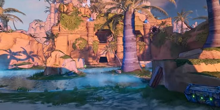 El País de las Maravillas aparentemente está lleno de desiertos que alcanzan temperaturas insoportablemente calientes, hasta el punto de que un Stabbomancer en Las maravillas de Tiny Tina podría freír un huevo en cualquiera de las piedras que hay alrededor. El Oasis Colmillo del Sol parece un lugar razonable para escapar de este calor devastador, lleno de “exuberante follaje, lagunas relucientes y ruinas colosales de civilizaciones pasadas”.