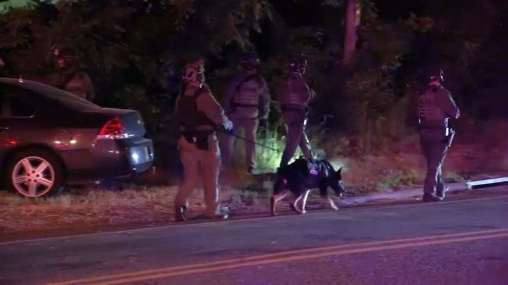 Se pudo ver a la policía registrando el área con perros en un gran perímetro.