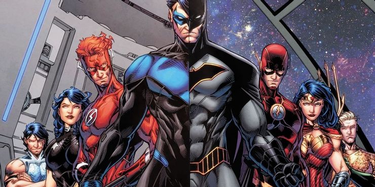 En titanes, Bruce Wayne y Wonder Woman cumplen con sus deberes dentro de la Liga de la Justicia, mientras que los héroes titulares imparten justicia en San Francisco y Gotham. Varios miembros de los Jóvenes Titanes en realidad han sido parte de la Liga de la Justicia. Cyborg, Starfire, Dick y no menos importante, Donna Troy, todos se inscribieron en Liga de la Justicia de América Vol 2 #41, aunque Donna deja el grupo a tiempo.