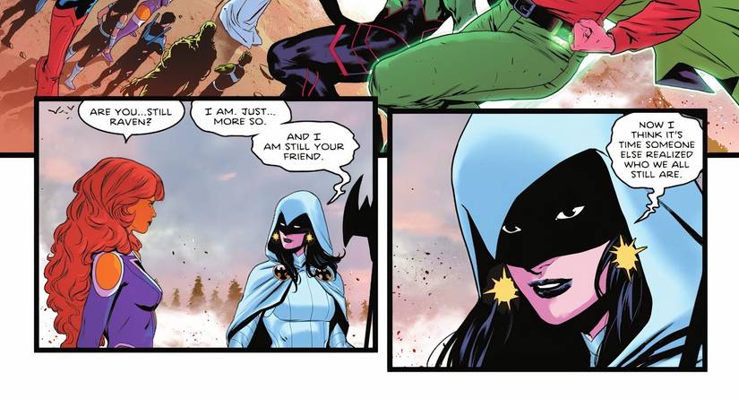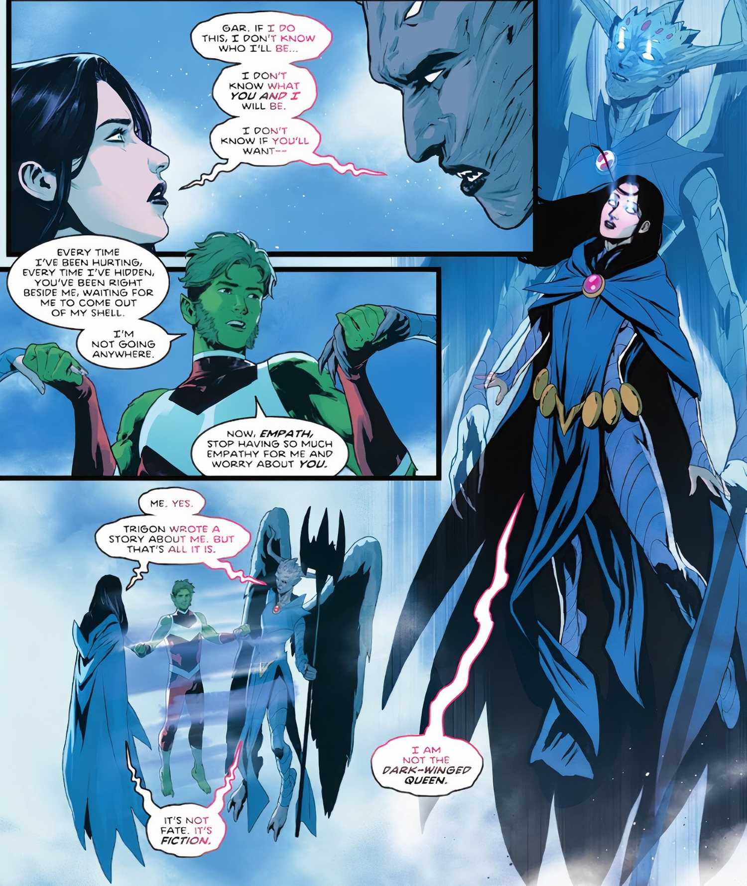 La fusión de Raven con la Reina de Alas Oscuras aporta no sólo un aumento de poder y un nuevo disfraz, sino también una profunda redefinición de su identidad. Después de la victoria sobre Trigon, Starfire se acerca a su vieja amiga y le pregunta: “¿Sigues… siendo Raven?” Esta pregunta refleja la preocupación de Starfire de que la fusión haya borrado al Cuervo que una vez conoció. Sin embargo, el empático la tranquiliza, afirmando: “Soy. Simplemente… más aún. Y sigo siendo tu amigo”. De este modo, Cuervo Sin duda, ha experimentado un cambio en su identidad al afirmar que ahora es más ella misma, pero sigue siendo la amiga Titanes hemos llegado a conocer y amar.