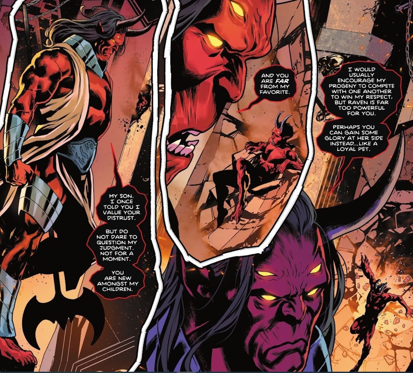 Trigon rápidamente afirma su autoridad, amonestando a Liam por interrogarlo y defiende firmemente su creencia de que esta versión de Raven cumplirá su oscuro destino, gobernando y destruyendo mundos junto al propio Trigon. Luego le recuerda a Trilogy: “Eres nuevo entre mis hijos. Y estás lejos de ser mi favorito“.