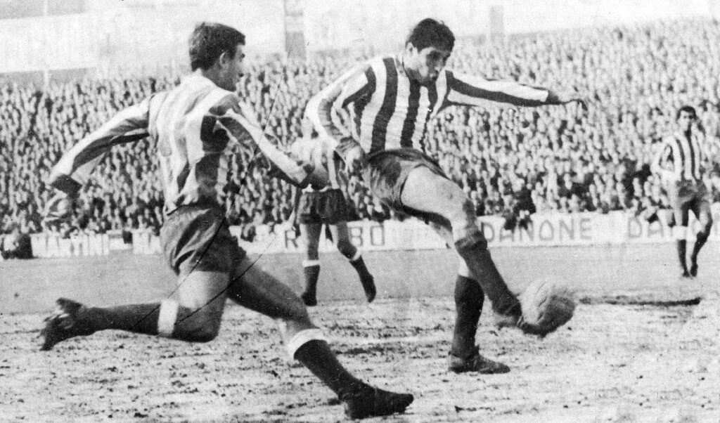 En Barcelona llueve fuerte ese fin de semana. El Espanyol está amenazado de promoción, necesita empatar. Tiene a Di Stéfano, cerca ya de los 40, que va a jugar su último partido de Liga. Se retirará definitivamente en breve, ante el Betis, en la Copa. “Ya no soy la saeta rubia, ahora soy la carreta rubia”, decía de sí con humor. La portería la cuida otro glorioso veterano, Carmelo. Tenía equipo para haberlo hecho mejor, pero… El Atlético llega con ansiedad. Necesita ganar y al Espanyol un empate le puede valer. En el aburrimiento de la concentración, entre naipes y naranjadas, los jugadores miran con aprensión la lluvia. Sarrià es pequeño, el Espanyol se cerrará, con el barro será todo más difícil.