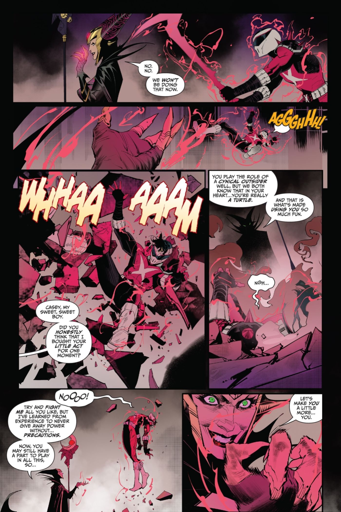 En Mighty Morphin Power Rangers/Teenage Mutant Ninja Turtles II #4 por Ryan Parrott y Dan Mora, los Mighty Mutant Power Rangers están luchando contra las fuerzas malvadas de Rita Repula y el General Krang en la Tierra, mientras que las Tortugas Ninja mutantes adolescentes se asociaron con Shredder y viajaron en secreto a la Dimensión X. El plan de las Tortugas era irrumpir en el Technodrome de Krang y encontrar una vulnerabilidad que puedan explotar. Mientras tanto, Casey Jones, quien se ha convertido en el aparentemente villano Ranger X y ha estado ‘trabajando con’ Rita y Krang, es descubierta como agente doble por la propia Rita. Rita dice que nunca confió realmente en Casey, incluso después de otorgarle su forma de Ranger X, diciendo que ella sabía, en su corazón, que él siempre estaba, “realmente una tortuga”.