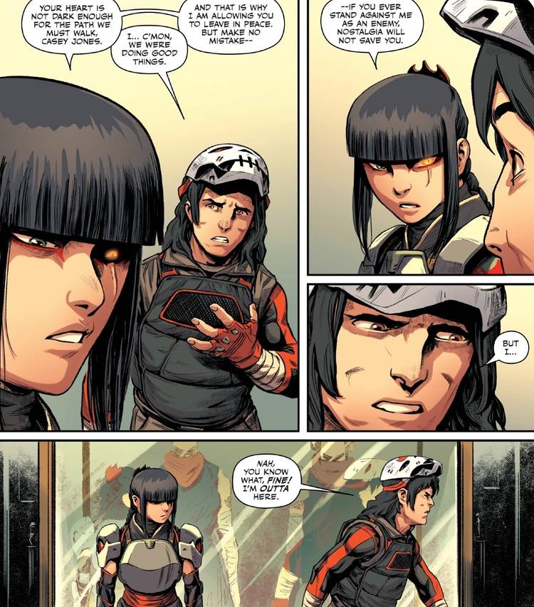 Para el crédito de Karai, su razonamiento para sacar a Casey Jones del clan de pies no es tan tranquilo como parece. Cuando él intenta discutir, ella simplemente dice: “Tu corazón no es lo suficientemente oscuro para el camino que debemos caminar, Casey Jones”. En realidad, ella lo está evitando estar cerca de ella, ya que está poseída por el viajero, un espíritu demoníaco que está sacando a relucir lo peor de ella. Aún así, desde la perspectiva de Casey, se está dejando de lado innecesariamente a pesar del trabajo que ha realizado con Karai para reformar el clan de pies como una mejor organización que la regla de Shredder.