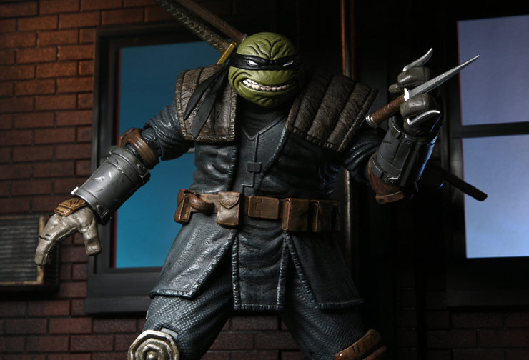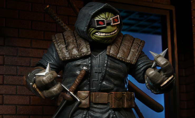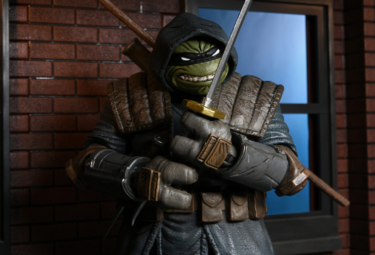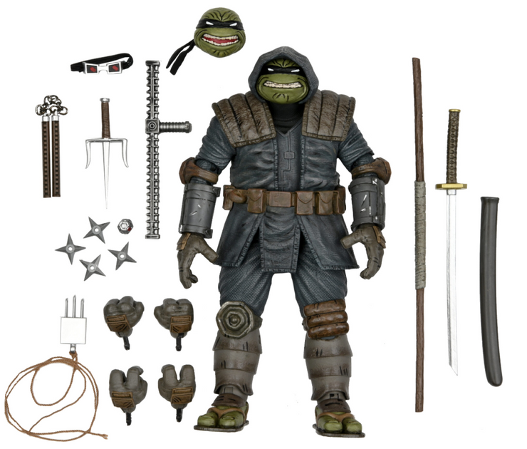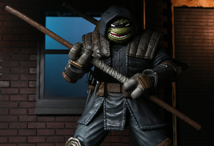 el ultimo ronin está ambientado en un futuro oscuro donde las Tortugas han sido derrotadas por sus enemigos, el Clan Foot, dejando solo una Tortuga sobreviviente para vengar a sus hermanos. Este héroe oscuro está capturado en una nueva figura de NECA, luciendo una variedad de armas reclamadas por sus aliados caídos, incluido el sai de Rafael, la katana de Leonardo, el bastón bo de Donatello y el nunchaku de Miguel Ángel, así como un gancho de agarre, tonga, bombas de humo, gafas y shuriken. El traje con capucha del héroe está sacado de las páginas de los cómics, con cabezas y manos intercambiables para las variadas poses de la figura con armadura de 7″.
