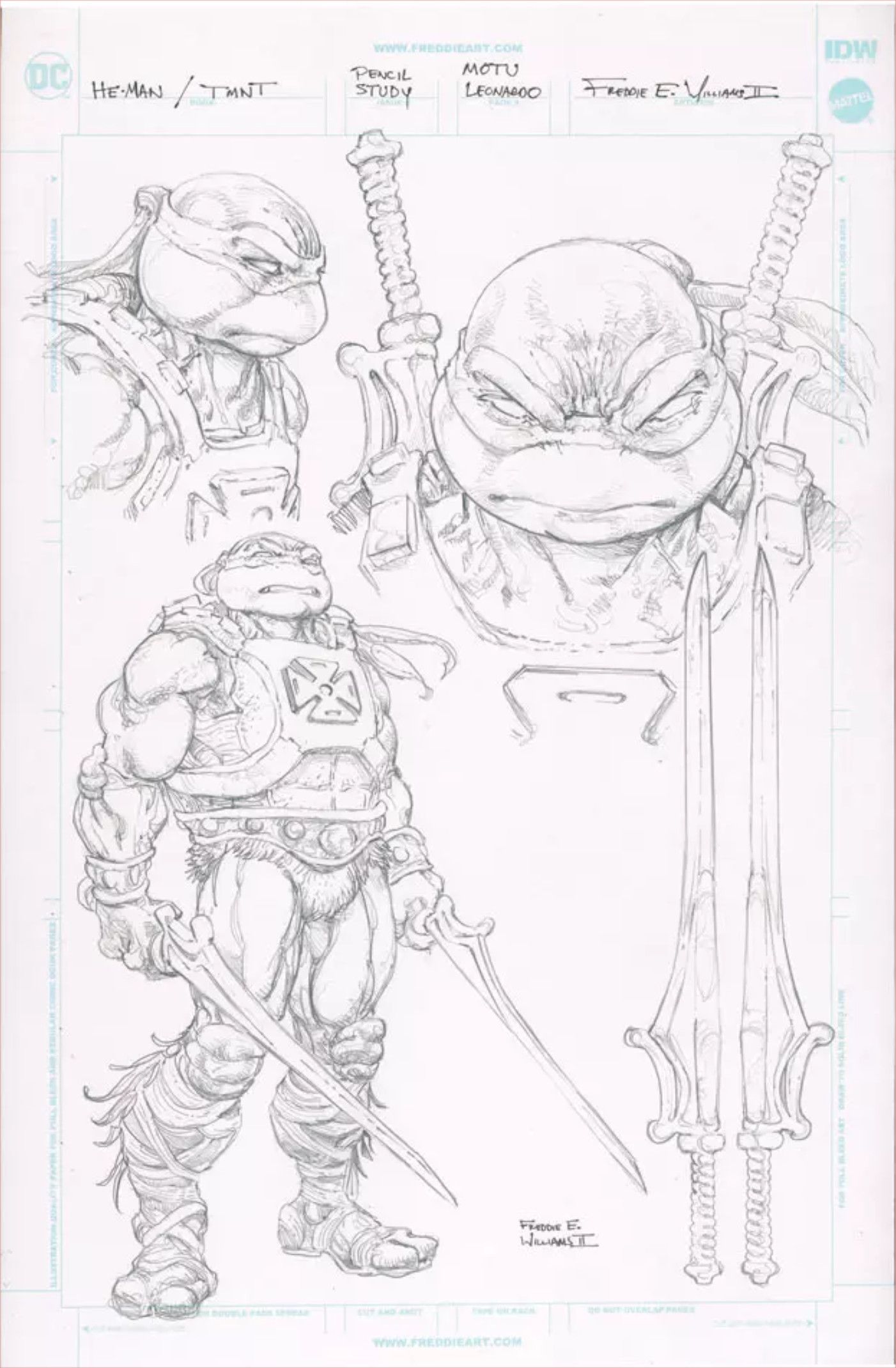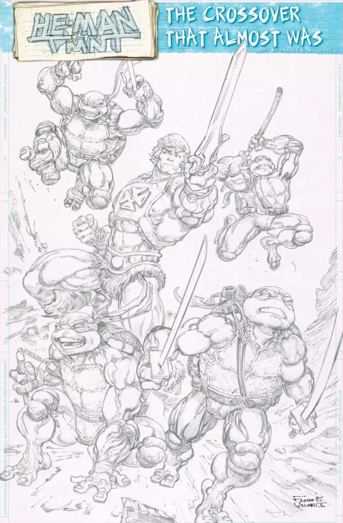 Williams comenzó a trabajar produciendo un puñado de estudios a lápiz para elaborar algunas ideas que él y Seeley habían discutido sobre cómo se cruzarían las Tortugas y He-Man. Algunos de los estudios incluidos en el cuaderno de bocetos muestran a Leo ataviado con el equipo de batalla de He-Man y empuñando ambas mitades de la Power Sword, que es un buen guiño al original. ISLA mini-cómics que venían empaquetados con los juguetes. Además, hay un toque increíble de Raph montando a Battle Cat. Sin embargo, en última instancia, el proyecto nunca llegó a buen término, y el proyecto se canceló oficialmente en 2020 antes de que pudiera comenzar cualquier trabajo oficial en la serie.