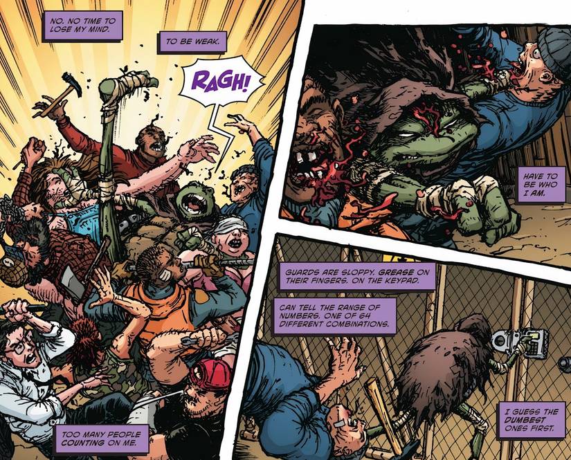 La mayoría se rendiría ante tal adversidad, pero Donatello se ha convertido en un mejor luchador a través de las inmensas dificultades que ha soportado. Cerca del final de este número, regresa al ring para enfrentarse a todos los retadores con los que se ha enfrentado hasta ahora, y todos ellos tienen una ventaja sobre Donnie en su estado debilitado. Sin embargo, Donatello logra eliminarlos usando tanto su ingenio como su puro poder de lucha. Después de confiar en la magia sobre los puñetazos en historias recientes, es reconfortante ver a Donatello convertirse en un luchador como Raphael cuando está contra una pared.