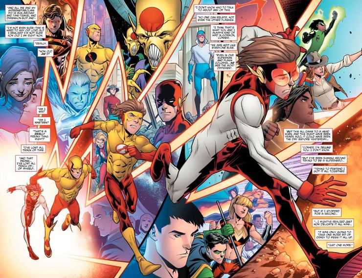 La totalidad DC comics historia de bart allen alias Impulso una vez fue representado a través de la fuerza de velocidad en un panel épico. El joven velocista recuerda su pasado como parte del Flash Familia mientras muestra el alcance de sus poderes.